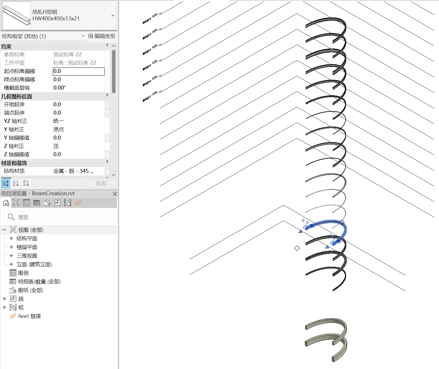 同样,只需要将curve = CreateArc(ctx, levelZ) 替换为 curve = CreateNurbSpline(ctx, levelZ)即可(注:不同的Nurbs几何形状/大小会影响FamilySymbol实例的创建,可能会因约束不满足而创建失败。这是正常的与手工创建无异)。生成结果: